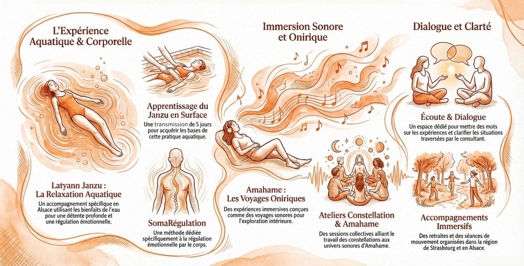 Ces expériences s’adressent à celles et ceux qui ressentent l’appel d’un changement vécu dans le corps, loin du mental, dans un cadre clair, sécurisé et respectueux.