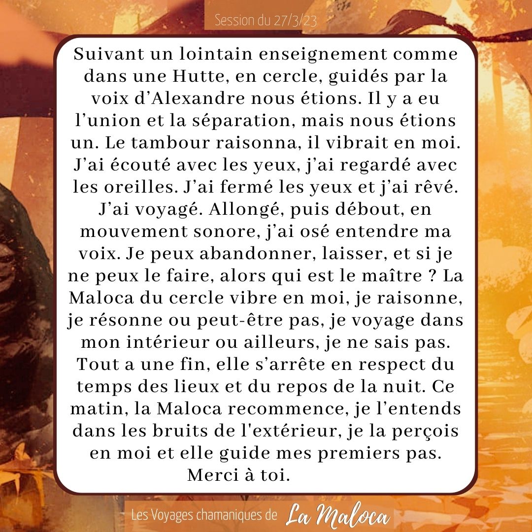 Tambour, chant et silence soutiennent un état de conscience modifié propice à l’exploration intérieure, au repos profond et à l’expression.